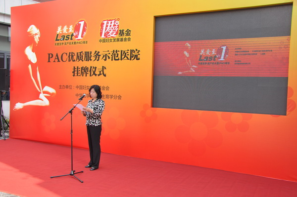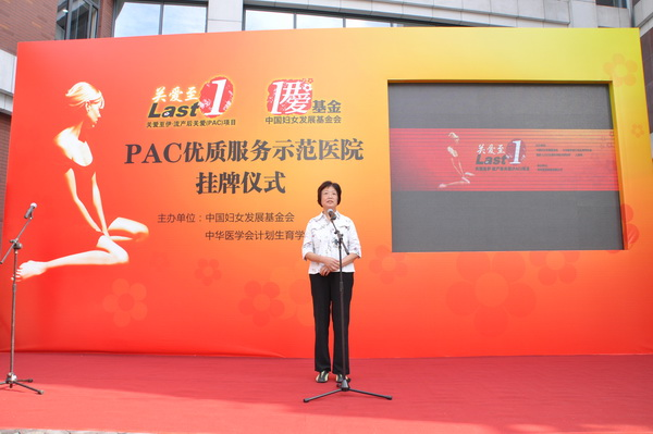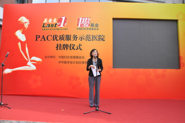 挂牌仪式在一段精彩的视频中拉开帷幕。视频介绍了我国人工流产的现状、PAC项目的由来以及妇产科医院PAC项目执行过程中的服务模式。PAC,即流产后关爱(Post-Abortion Care),是一种标准化的医疗服务流程,通过一系列的服务,来向大众,尤其是前来接受人工流产手术的患者宣传避孕知识、落实有效的避孕方法。该项目由中国妇女发展基金会、中华医学会计划生育学分会、国家人口计生委科学技术研究所共同发起,目前正在全国范围内推广。妇产科医院因率先在国内开展了PAC专家门诊,并以出色的表现获得了中国妇女发展基金会和中华医学会计划生育学分会共同认可的“PAC优质服务示范医院”称号。
